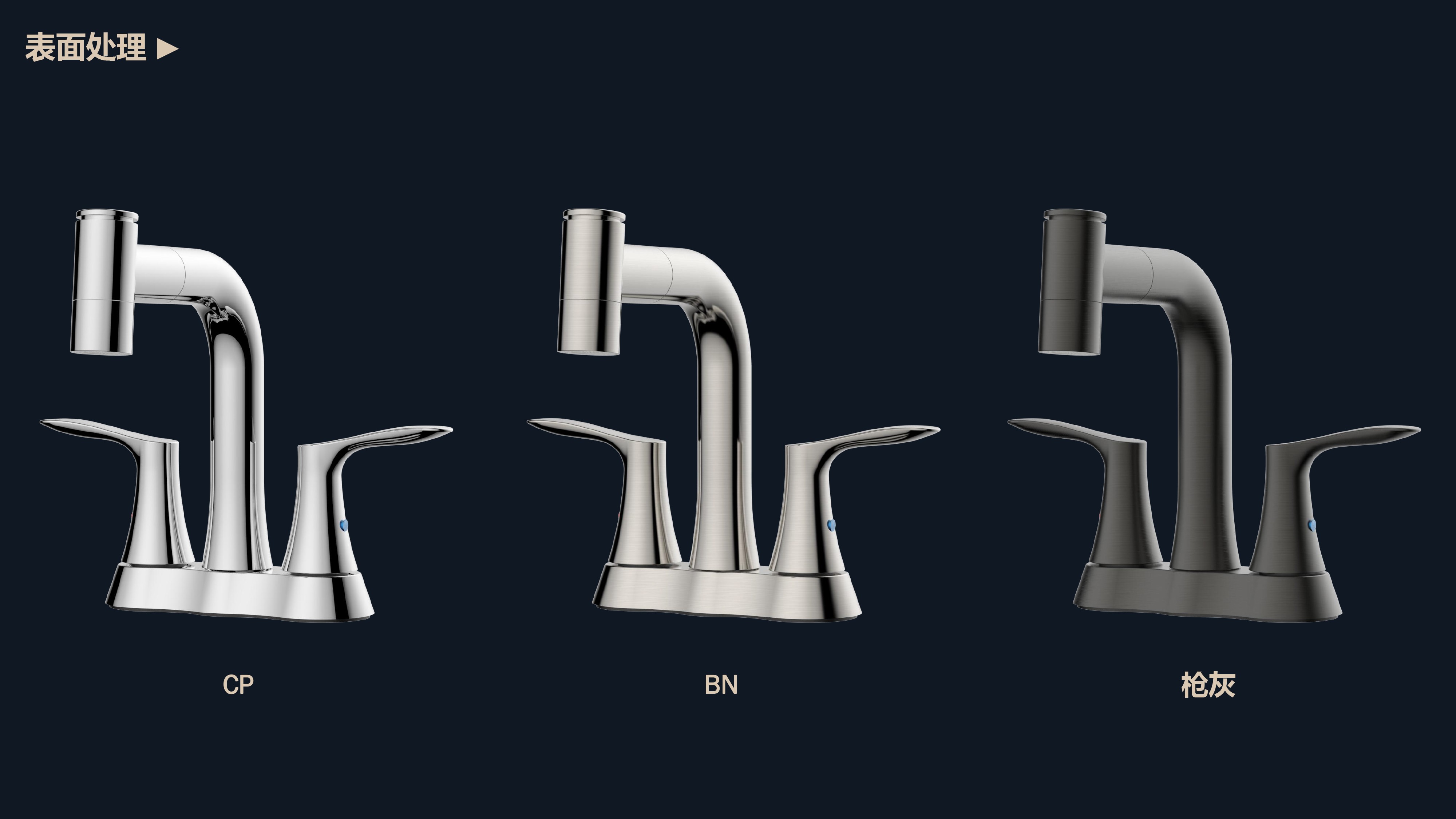 溫感三色LED燈光出水;日常洗頭利器,抽拉出水輕松洗;按壓切換兩功能水花;適合4寸3孔安裝臺面