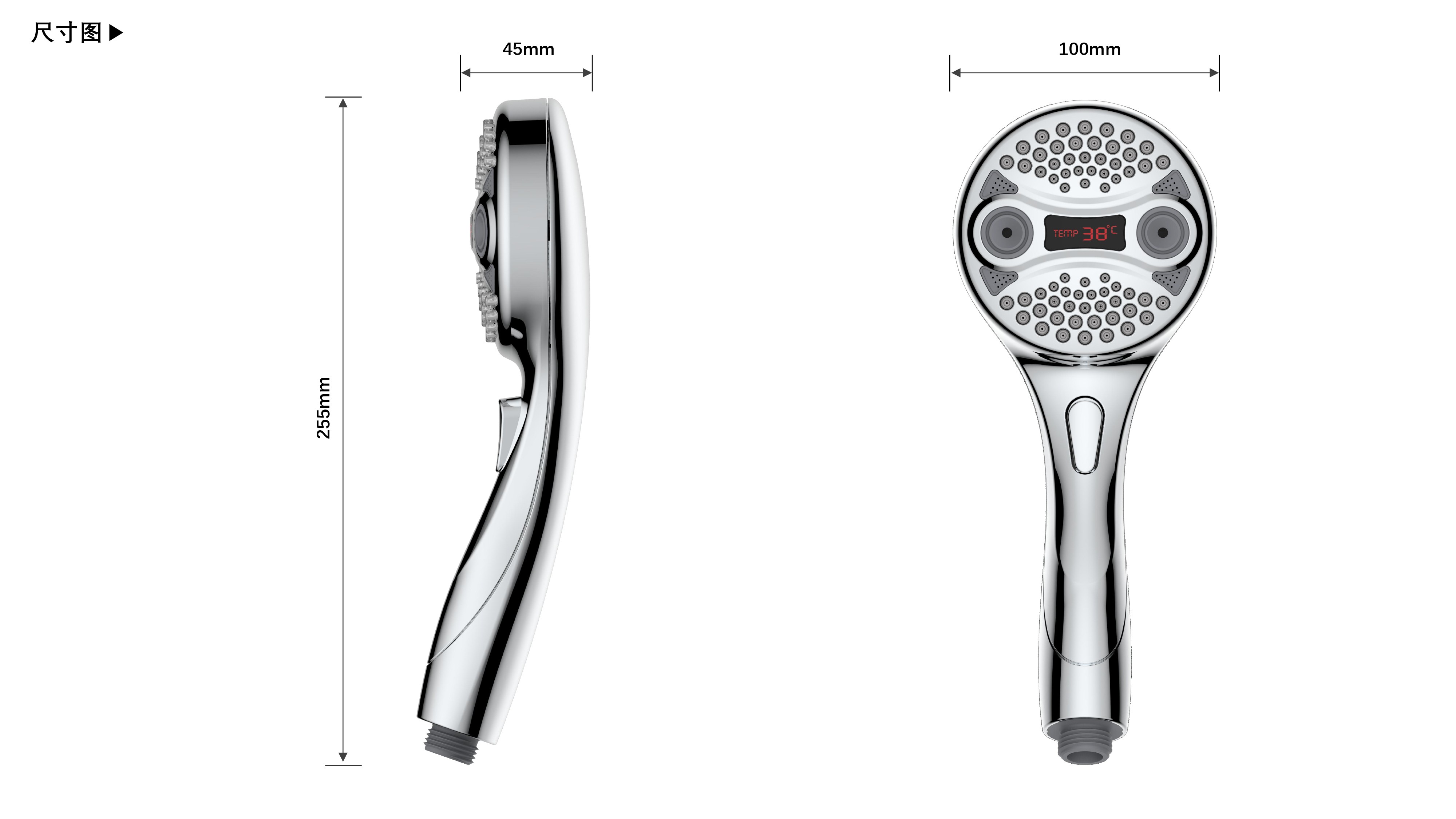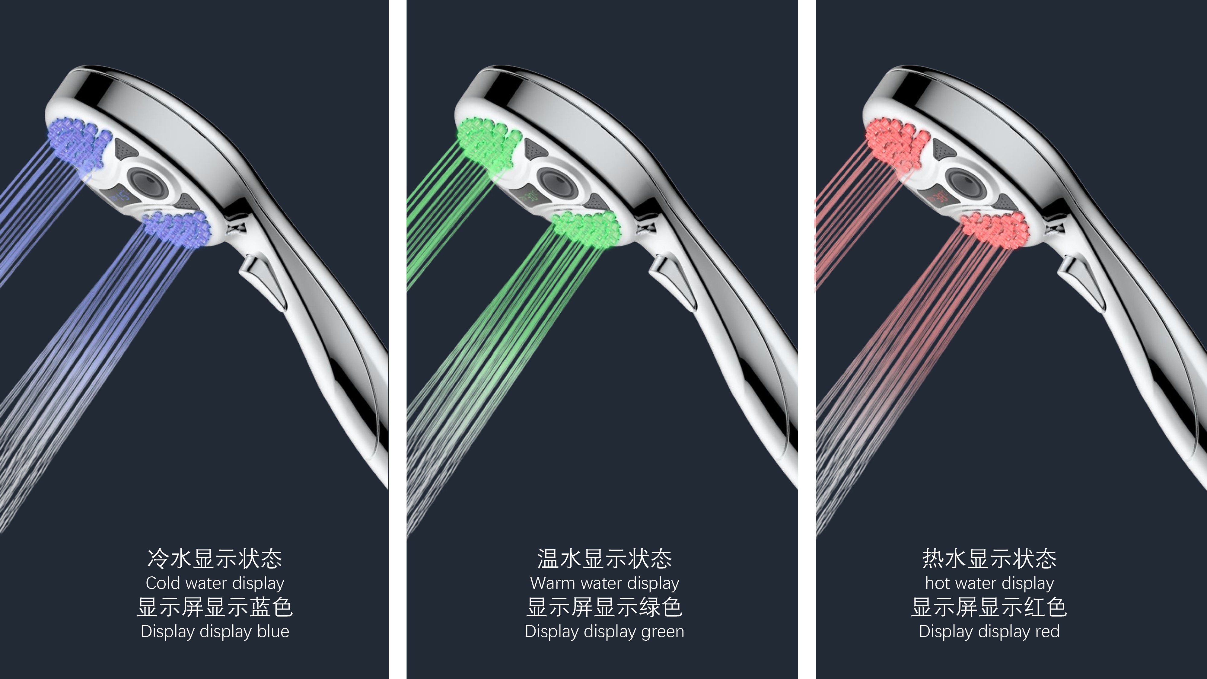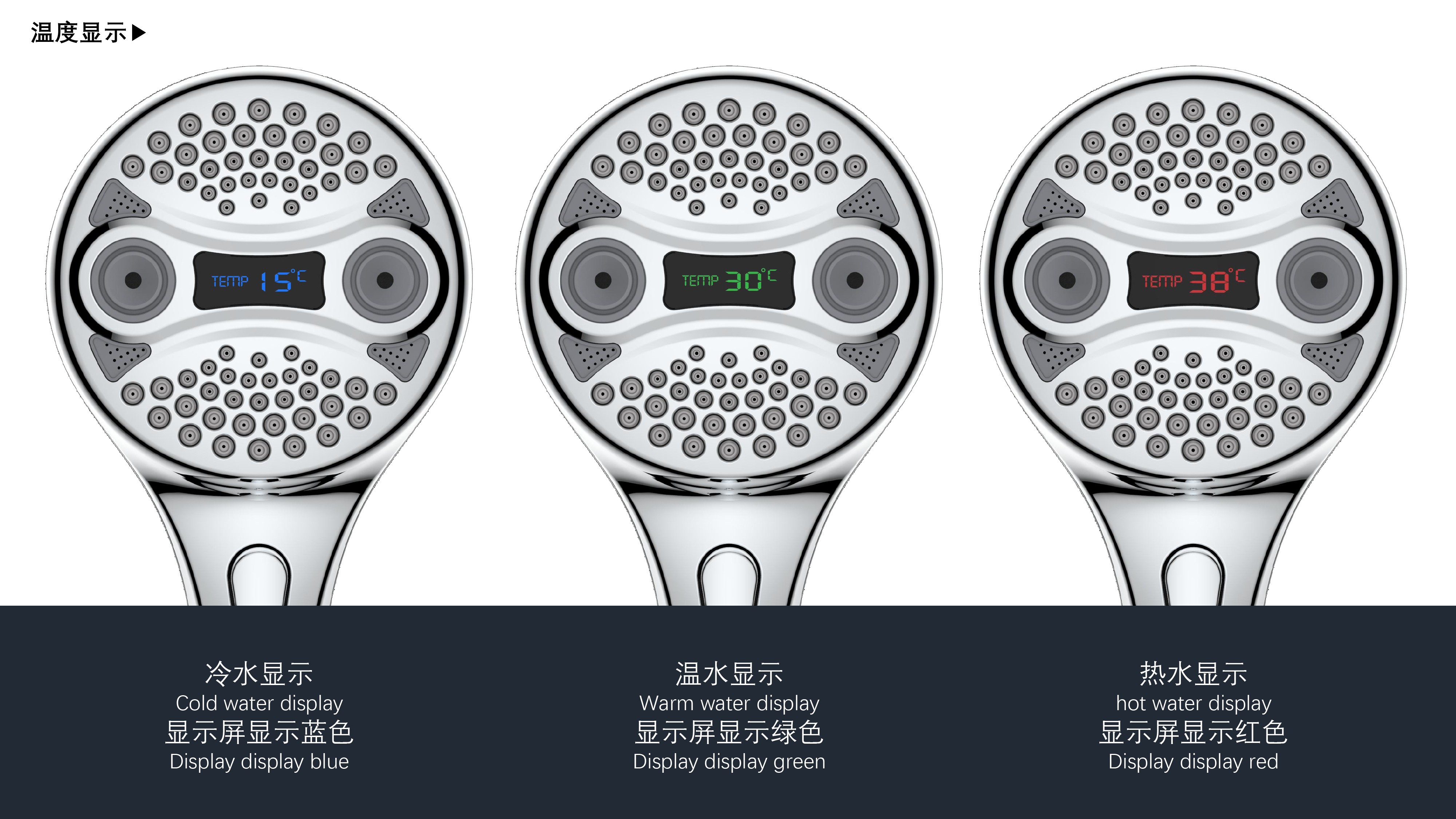 三功能溫顯花灑;獨(dú)特E.T.外觀設(shè)計(jì);TPR出水孔,輕撥除垢;LED三色出水,看得見的水溫;按鍵切換三檔模式出水;握感舒適防滑