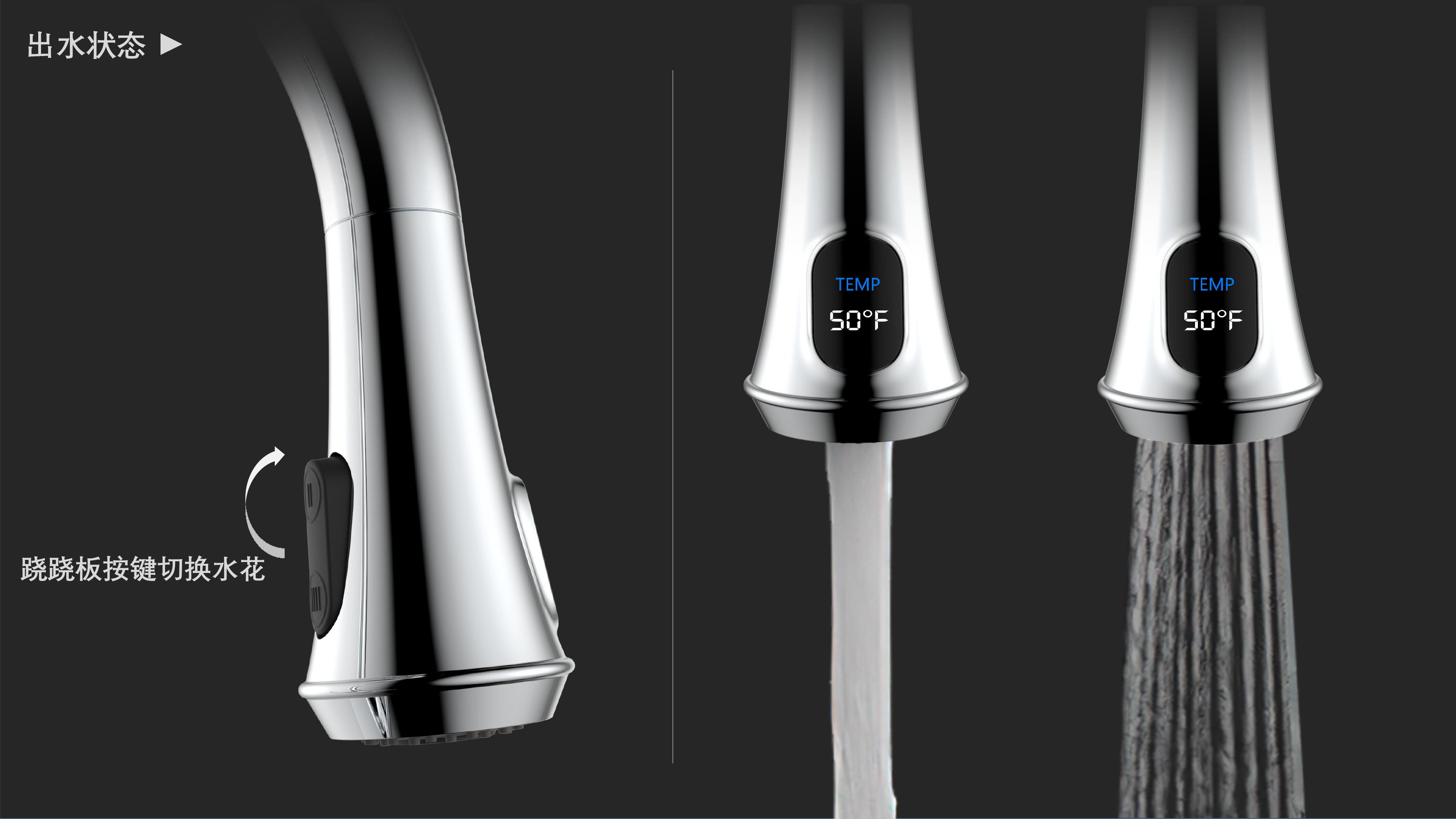 古典廚房龍頭;抽拉頭隨意抽拉多角度使用;采用全密封防水端頭;水力發(fā)電技術(shù),智能芯片溫度數(shù)顯-冷水TEMP顯示藍(lán)色、溫水TEMP顯示綠色、熱水TEMP顯示紅色